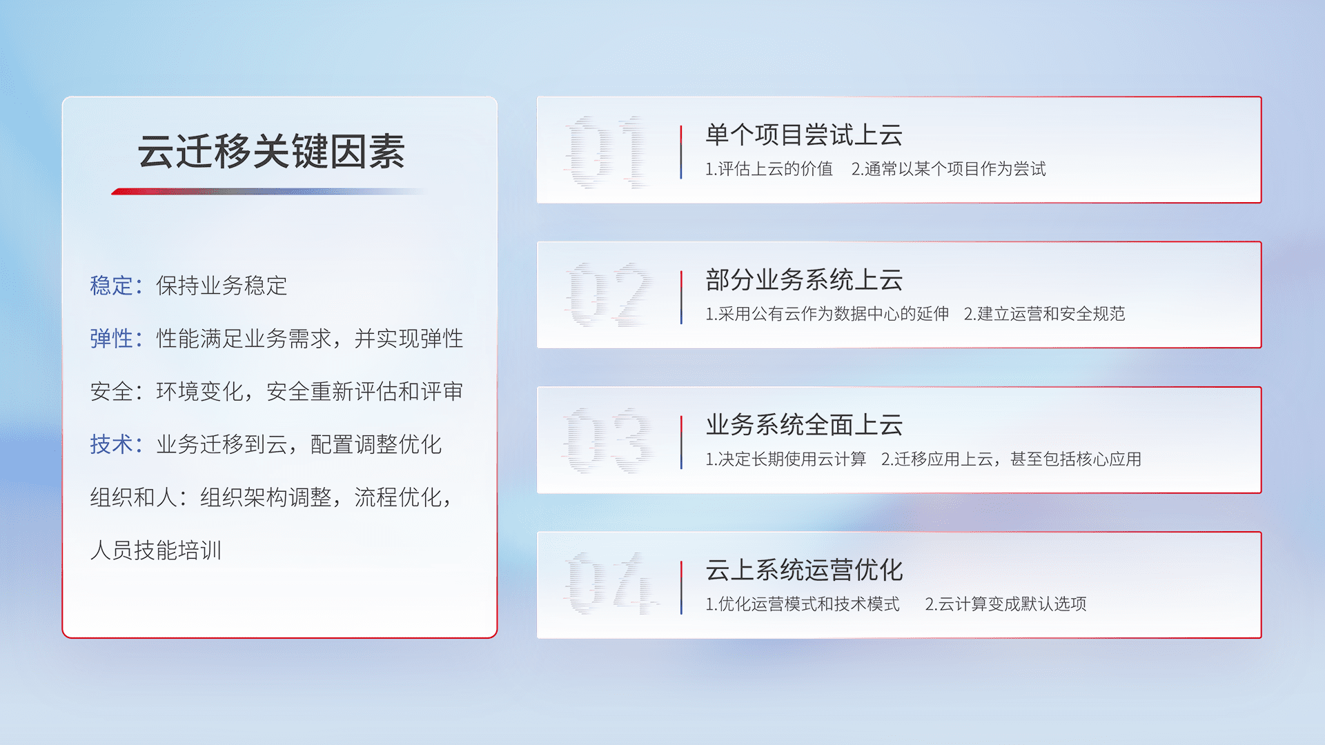 结合实际业务,,,,从规划设计、、、云平台选型、、、、云原生改造、、数据迁移、、、集成交付,,迁移全过程为客户识别最佳上云路径,,,做好风险识别管理,,,设计网络架构、、、身份权限、、安全审计合规、、操作审计、、、日志审计、、监控告警策略、、、、多站点容灾设计等,,,对云上基础设施进行整体规划,,,,提升IT治理水平,,,,以满足弹性、、、、高可用、、、、高性能的需求。。。。
