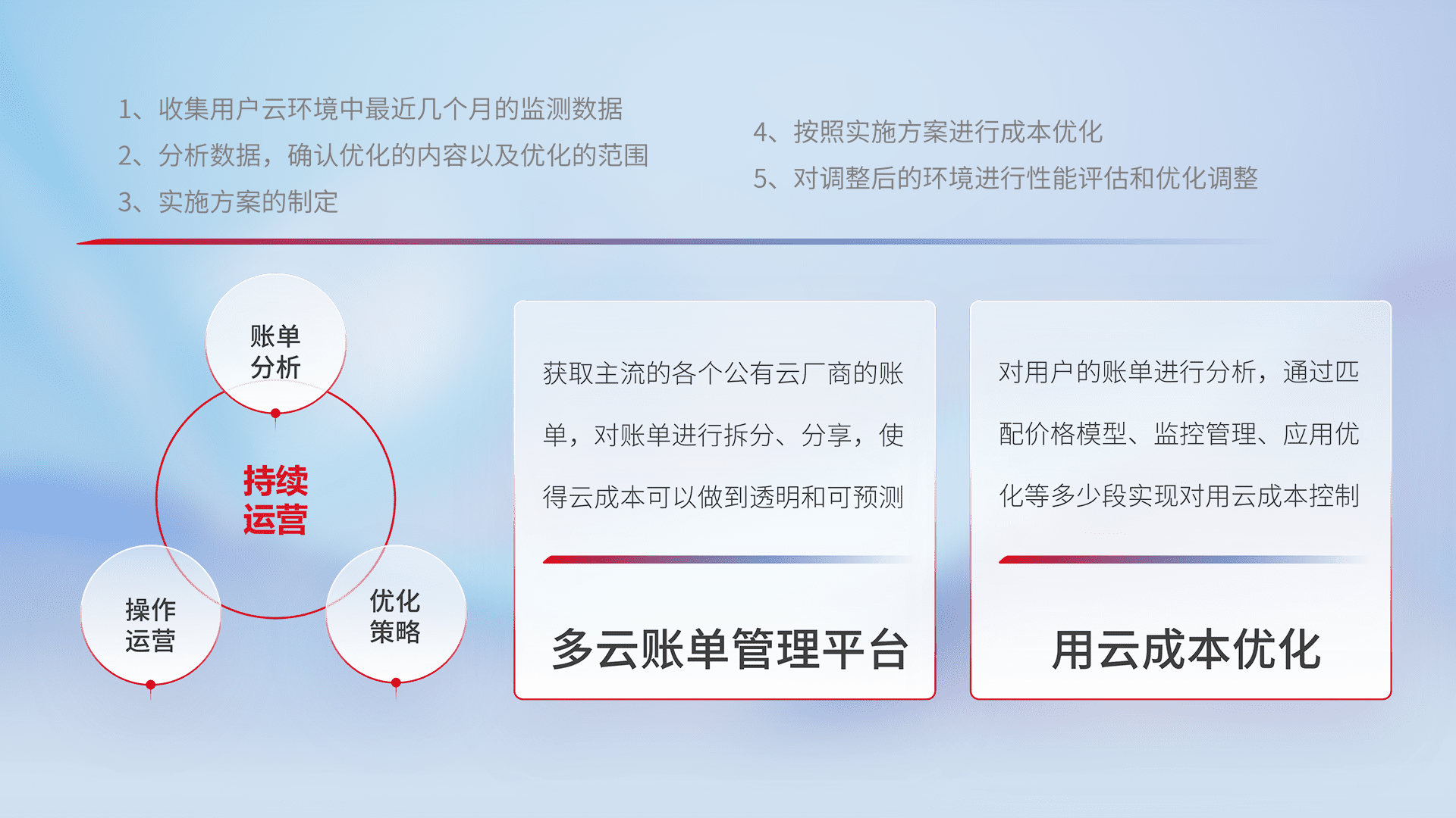通过多云纳管,,,,以统一的资源数据模型把客户的云资源进行抽象和封装,,,,进而实现对多云资源的统一操作,,,,保障云资源管理的可靠性、、、稳定性与可用性。。。。量身定制化运维内容,,配置、、、开发运维、、补丁管理、、、、备份、、监控、、、、认证和访问管理、、、审计和日常巡检等,,,保障在用云过程中的可靠度,,稳定度以及高可用率。。。。