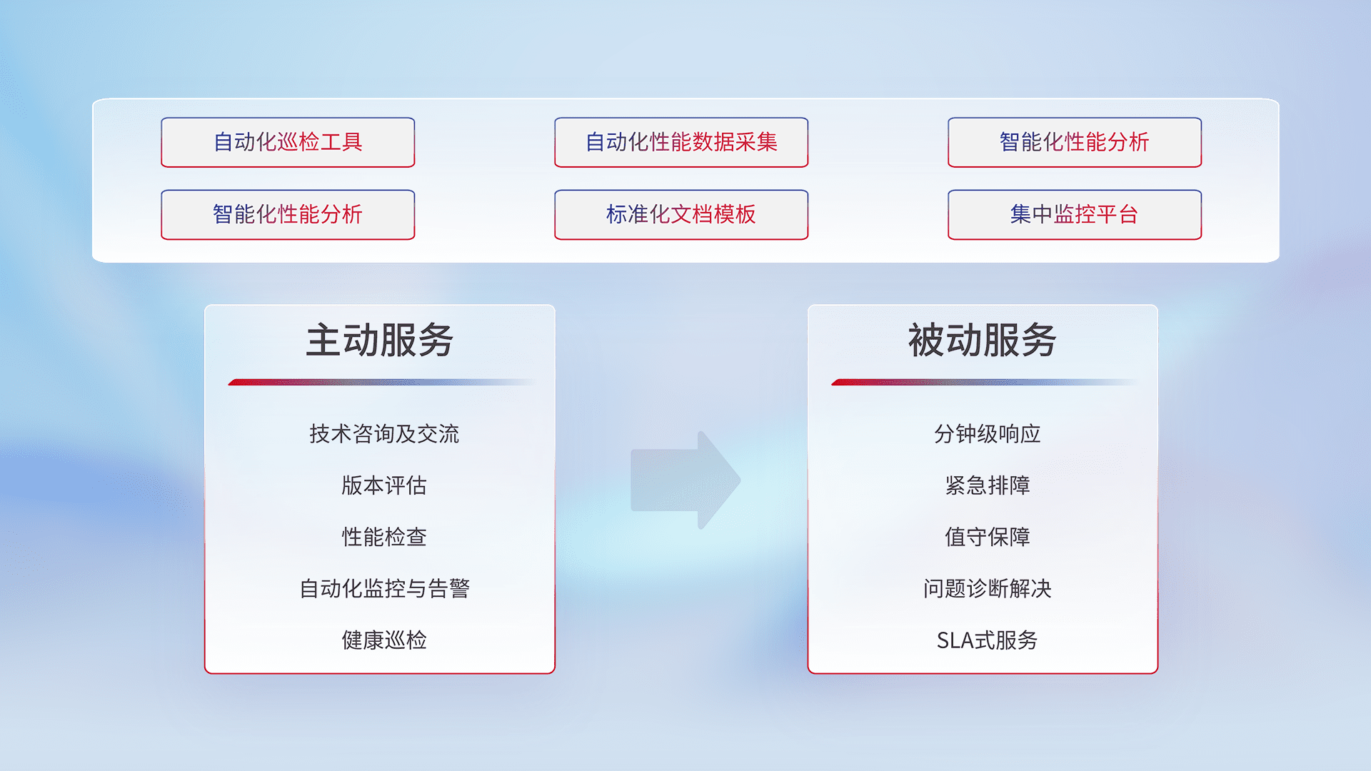 智能化工具和标准化文档,,保障服务质量,,,提供主动服务(包含技术咨询、、版本评估、、性能检查、、自动化监控与告警、、、健康巡检)和被动服务包含(分钟级响应、、、紧急排障、、、值守保障、、问题诊断解决、、、SLA服务)。。。。